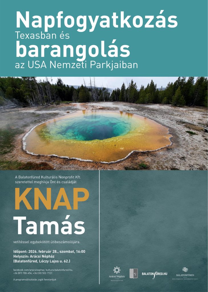 Knap Tamás régi nagy szenvedélye az utazás, így jutott el 2024-ben az Egyesült Államokba, ahol egy 89 napos kalandra indult, amely során 30 tagállamot érintve közel 25 ezer kilométert tett meg autóval, 370 kilométert busszal és 516 kilométert gyalog. Számos Nemzeti Parkot csodálhatott meg, többek között az Everglades, Death Valley, Zion, Bryce Canyon, Arches, Joshua Tree, Sequoia, Yosemite, Glacier, Yellowstone Parkokat, melyek lenyűgöző hatást tettek rá. Az USA-ban eltöltött hónapok során betekintést nyert a természet változatos szépségeibe, melyről az előadás során igyekszik átfogó képet nyújtani.