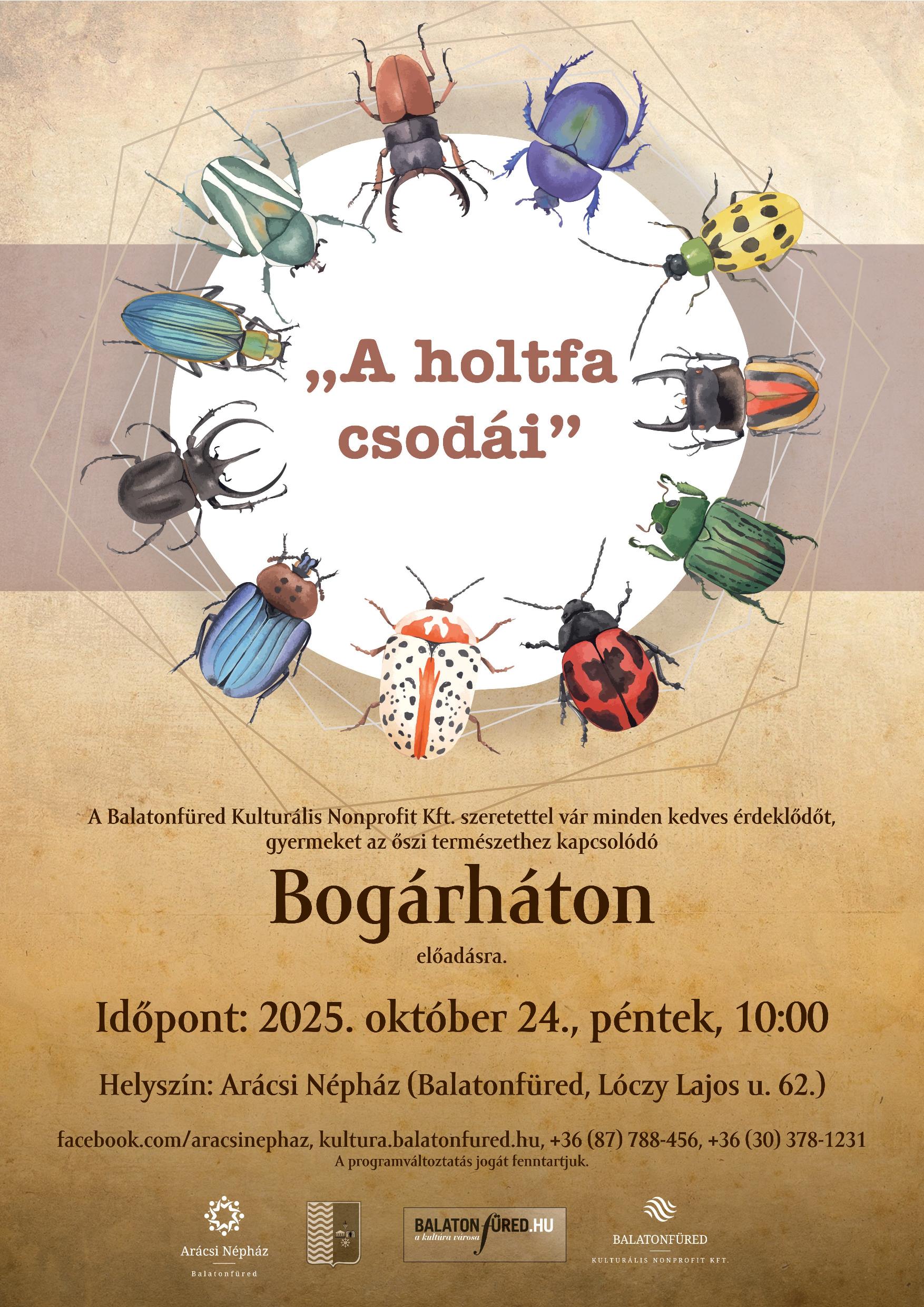 Bogárháton: A holt fa csodái 2025-10-24 10:00 - 12:00 Arácsi Népház Address: Balatonfüred, Lóczy Lajos utca 62. Bogárháton című előadás gyerekeknek.