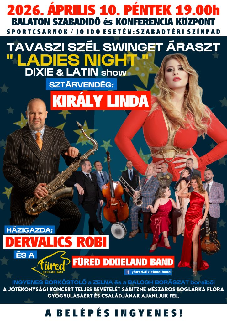 Dixie és latin show 2026-04-10 19:00 - 22:00 Balaton Szabadidő és Konferencia Központ Address: Balatonfüred, Horváth Mihály utca 64. Jótékonysági koncert. Füred Dixieland Band koncertje, sztárvendég: Király Linda.