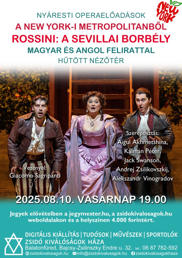 Külön öröm, hogy Bartolo szerepében a magyar basszbariton, Kálmán Péter debütál a Metben. A Rosinának titokban udvarló Almaviva gróf figurájában a szintén Met-debütáns amerikai Jack Swanson lép elénk. A történéseket cseleivel helyes irányba befolyásoló borbély, Figaro szerepében Andrej Zsilikovszkij moldovai bariton látható, az orosz Alekszandr Vinogradov pedig Don Basilio zenetanár szerepében áll színpadra.