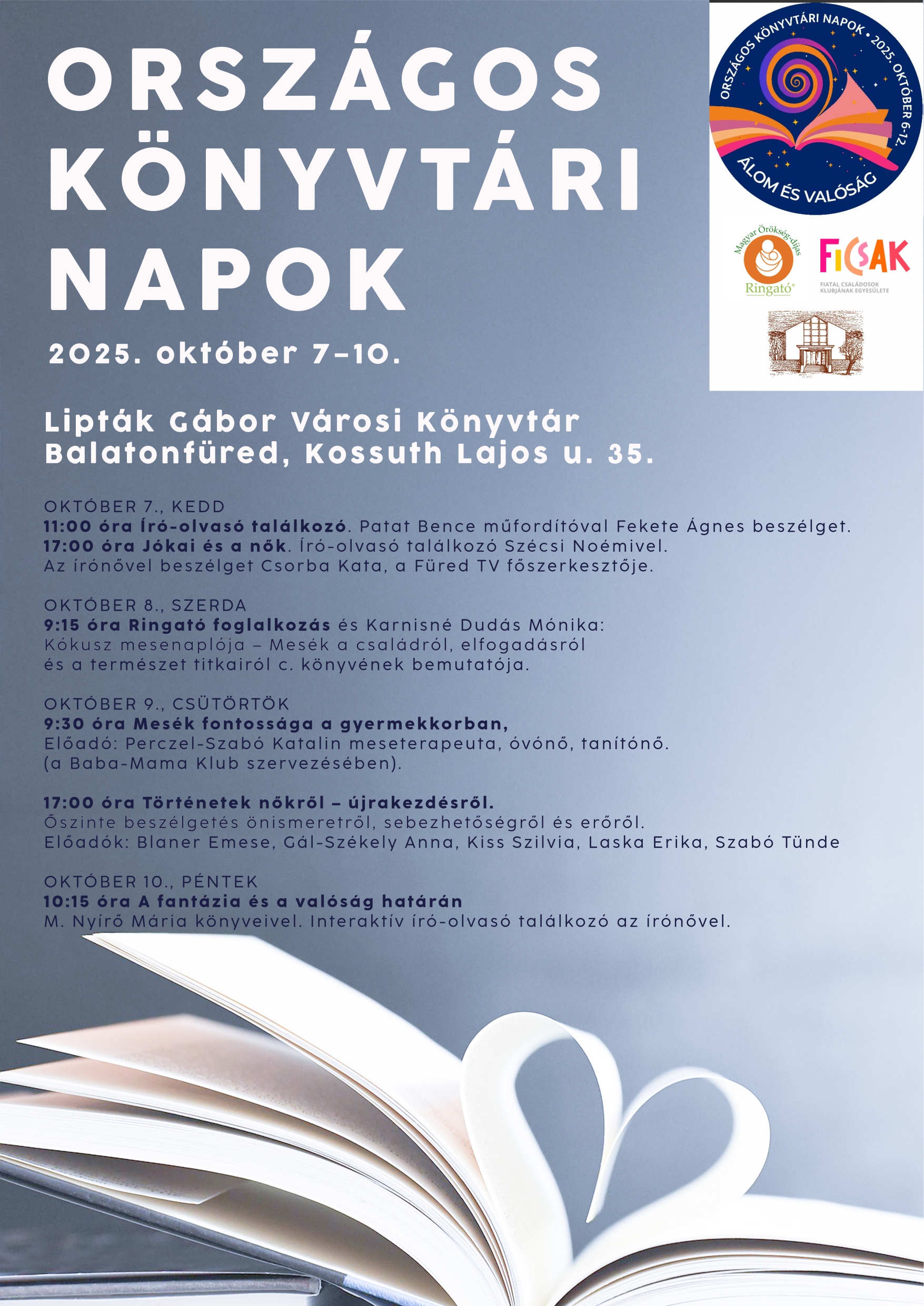 Országos Könyvtári Napok 2025-10-07 11:00 - 2025-10-10 12:00 Lipták Gábor Városi Könyvtár Az országos programsorozat füredi eseményei. Író-olvasó találkozók, mesék és irodalmi beszélgetések.