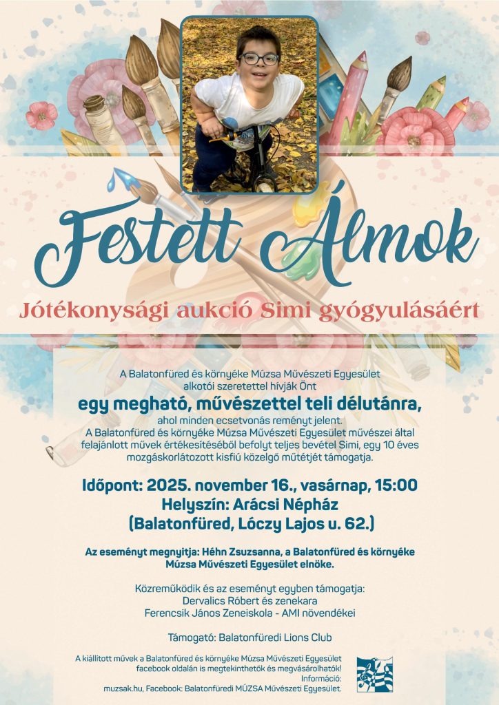 A Balatonfüred és környéke Múzsa Művészeti Egyesület művészei által felajánlott művek értékesítéséből befolyt teljes bevétel Simi, egy 10 éves mozgáskorlátozott kisfiú közelgő műtétjét támogatja.