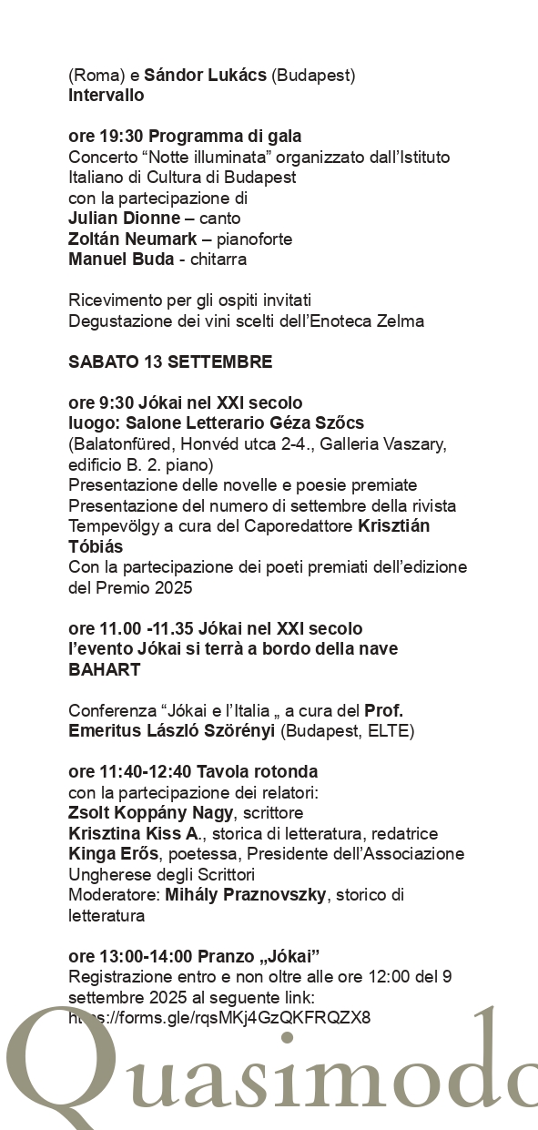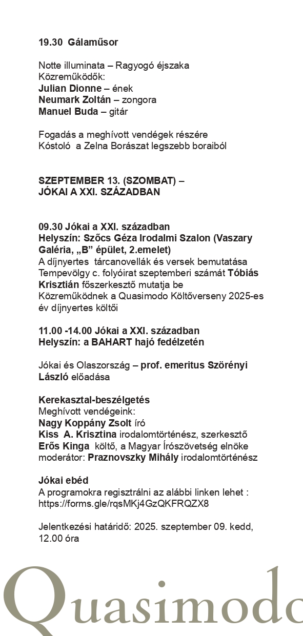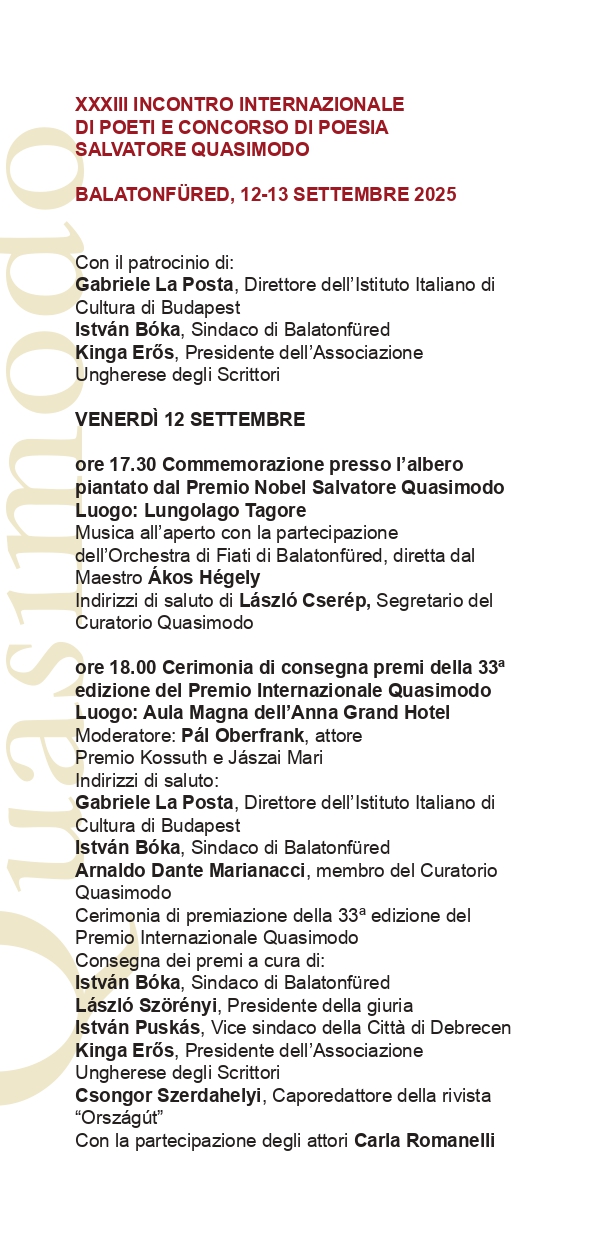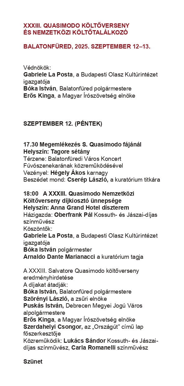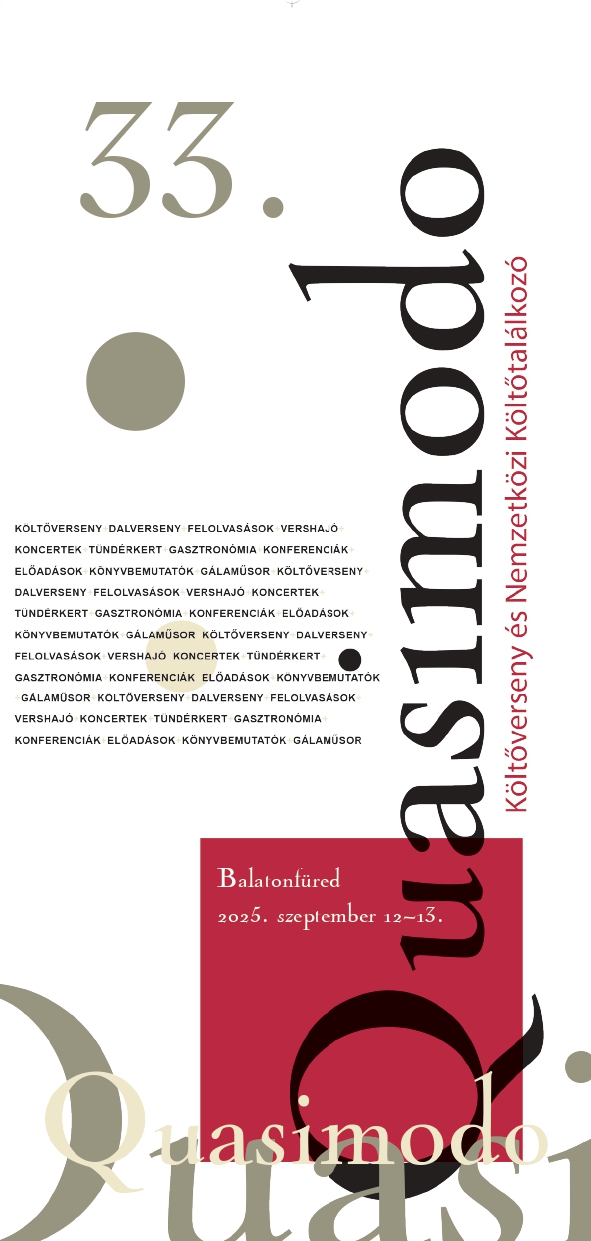 Hírek 33. Quasimodo Költőverseny és Nemzetközi Költőtalálkozó 2025.09.12-13. 33. Quasimodo Költőverseny és Nemzetközi Költőtalálkozó 2025.09.12-13.