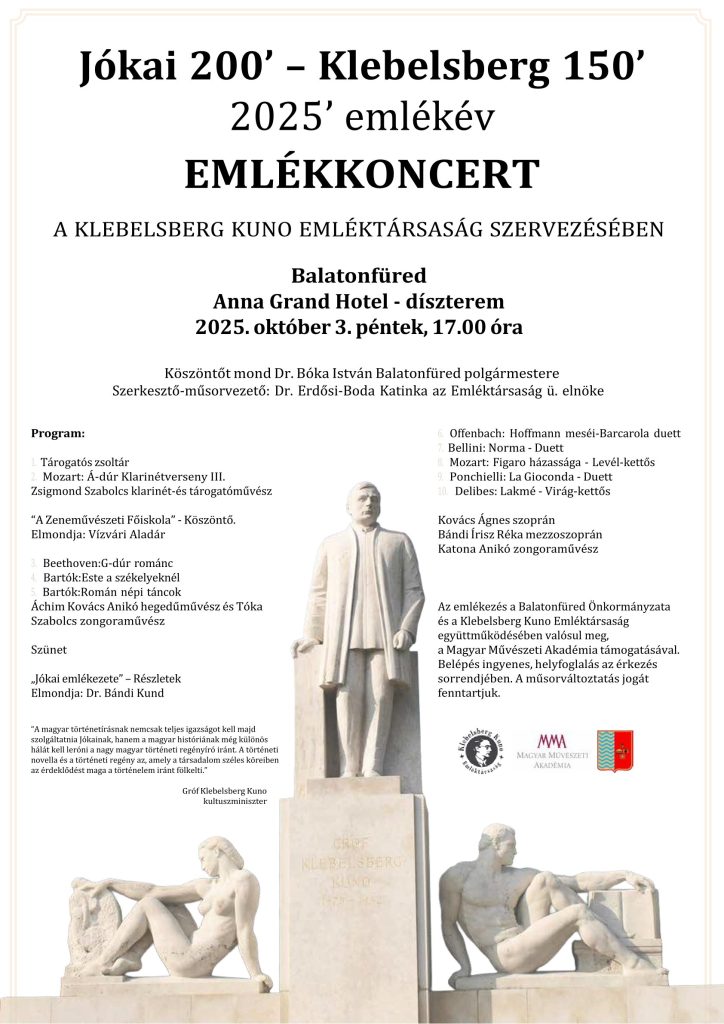 Hírek Jókai 200 – Klebelsberg 150 emlékkoncert 2025.10.03. 17:00 Anna Grand Hotel Díszterem Jókai 200 – Klebelsberg 150 emlékkoncert 2025.10.03. 17:00 Anna Grand Hotel Díszterem