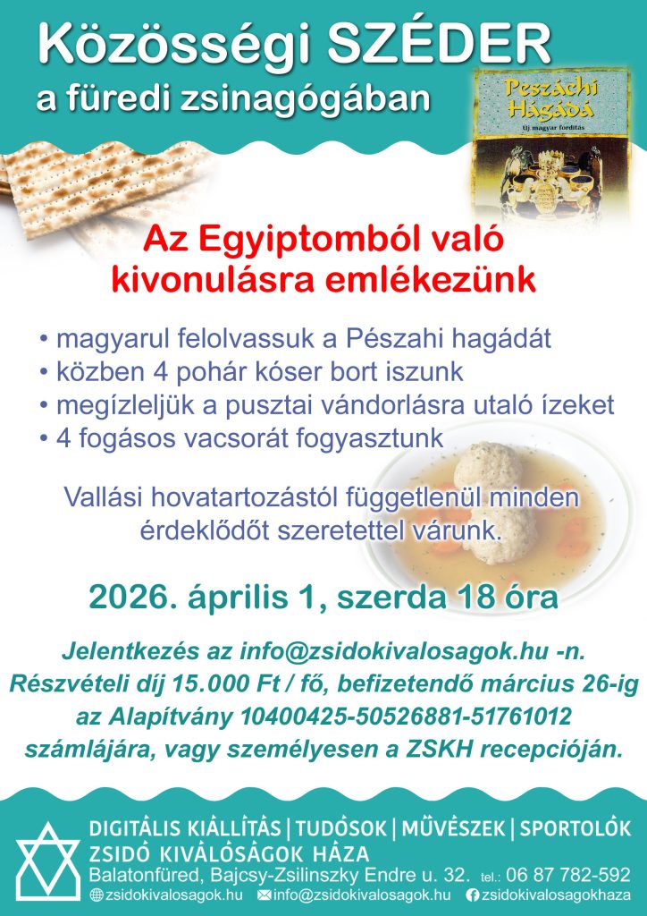 Április 1-én este, az első Széderrel kezdődik a 8 napos Pészah, a zsidó „húsvét” ünnepe. Ezen az estén elmeséljük az Egyiptomból való kivonulás bibliai történetét és az alkalomhoz illő ételeket fogyasztunk. Örvendünk a zsidó nép rabságból való kiszabadulásának. Vallási hovatartozástól függetlenül várjuk azokat, akik érdeklődnek a történet és a kulináris élmények iránt.