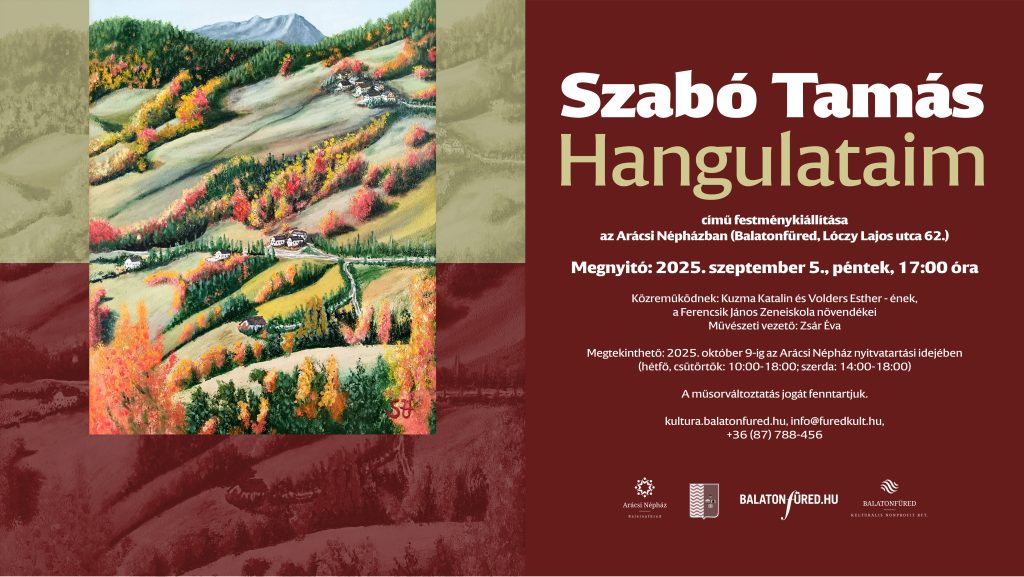 A Balatonfüred Kulturális Nonprofit Kft. tisztelettel meghívja Önt és családját Szabó Tamás „Hangulataim” című festménykiállításának megnyitójára.